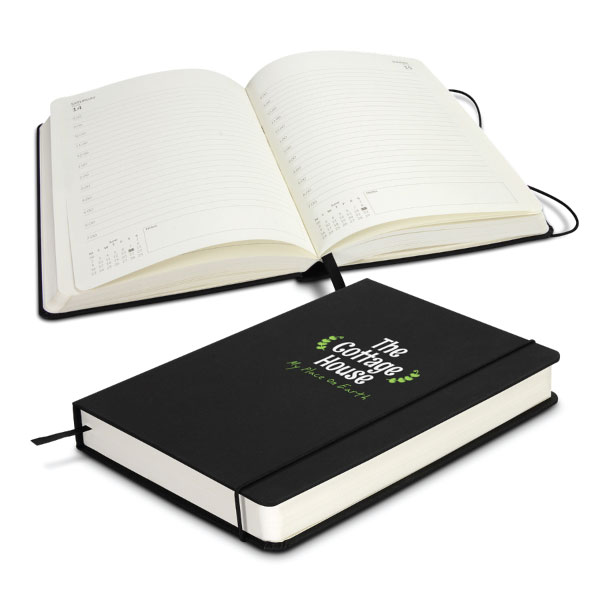 This 2025 diary spans from January to December, with each day presented of a single page. It has a leather look PU cover and 210 leaves (420 pages) of ivory coloured 80gsm paper inside. Features include bookmark ribbon, a document pocket, and an elastic closure. There are extra pages like a contact page, project planning and more. Personalisation available at extra cost.