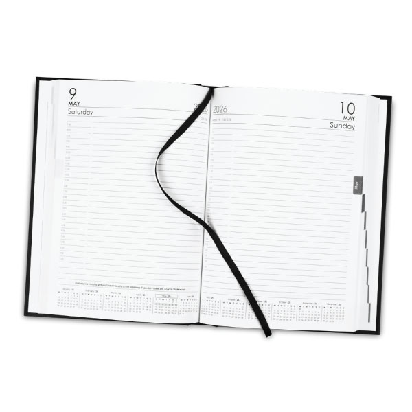 This Collins 2026 daily diary spans from January to December, showing a day format with 30 minute appointment times. It's hard cover and features a personal information page, monthly planners, school terms and more. Personalisation available at extra cost.