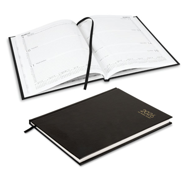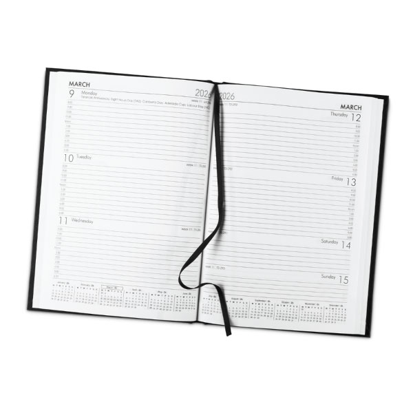 This Collins 2026 diary spans from January to December, showing a weekly format with hourly appointment times. It's hard cover and features a personal information page, monthly planners, school terms and more. Personalisation available at extra cost.