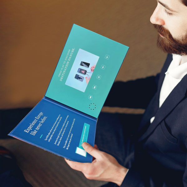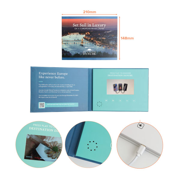 This unique and impactful 4.3inch LCD Video Brochure is guaranteed to impress! Open up the brochure and you’ll see a LCD screen with 480×272 resolution to play your message.The paperboard cover is 157gsm and is mounted on 1200g grey cardboard for unmatched quality. It has a 4g memory and allows you to easily update videos and has a long-lasting 650mAh battery.