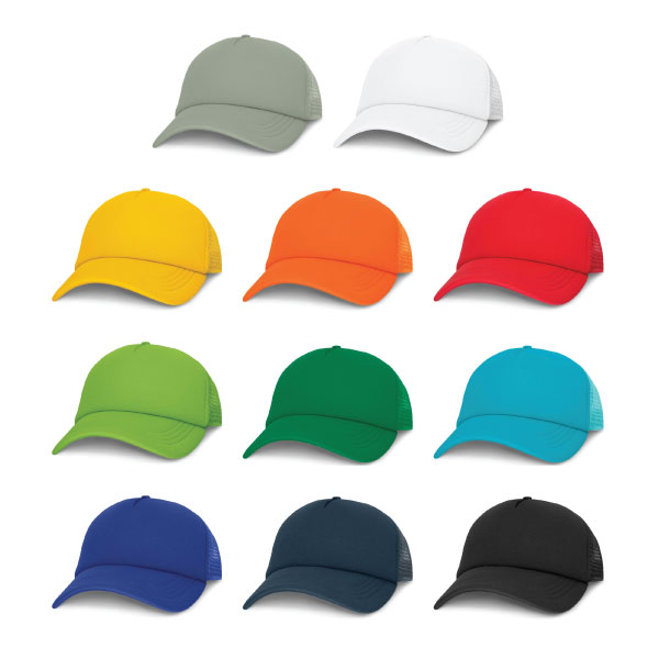 The Aero Trucker Cap is a premium quality, structured five panel trucker style cap with a padded polyester front and breathable mesh on the side and back panels. It has a pre-curved peak, a sweat band and an adjustable snap back closure which allows one size to fit most people.