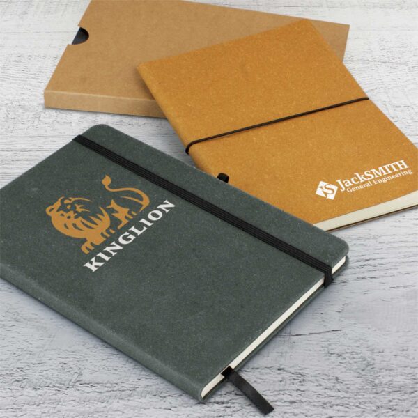 The Aratula Recycled Notebook is an environmentally-conscious notebook which is available in either soft or hard cover which is manufactured from recycled leather, giving the notebook a unique textured finish and a natural look. The notebook is presented in a natural unbleached cardboard sleeve and has 80 leaf (160 pages) of 70gsm lined cream paper with a date grid printed on each page. Other features include a bookmark ribbon, an elastic band closure and a recycled leather icon on the back cover.