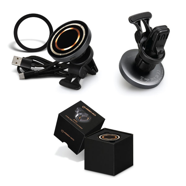 The Arc is an elegant and quality 15W magnetic wireless car charger! It clips securely onto any car vent and is adjustable. The sleek charger is compatible with all phones, as it comes with a metal ring for the non MagSafe phones. It features LED charging indicator lights and is easy to use one handed. Input power is DC 5V/2A , DC 9V/2A. Comes in a INGENIO branded gift box.