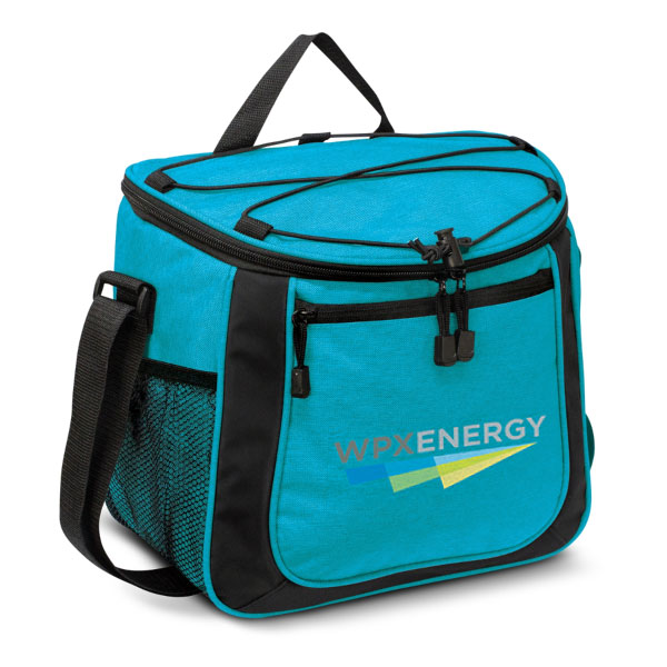 This cooler bag has an impressive capacity of 13L and has thick foam insulation encased in a water resistant PEVA inner liner. The outside has a large zipped, two mesh side products and is made of 600D polyester. Other features include a zippered top closure, smart zipper pulls, a woven carry handle and trendy elastic lacing