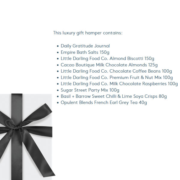 Delight and excite everyone with this calming Aromatherapy Hamper! The gift hamper contains quality products such as bath salts, journal, chocolate raspberries and more! It is all presented beautifully in a glossy gift box with tissue paper and satin hand-bowed ribbon. The hamper comes with branded gift cards. This is a perfect gift option for Christmas, for valued clients and any other occasion!