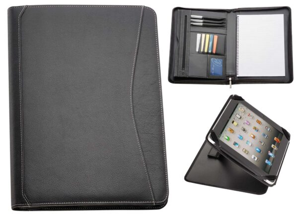 The Ashford A4 Leather Compendium is manufactured from full grain leather with contrast stitching. Features include business card holder, 3 pen holders, zippered pocket, 5 credit card pockets, 2 internal pockets and A4 spiral pad which inserts from the side. Talk to us about optional tablet holder. See image for product colour.