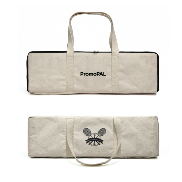 Keep fit while having fun with this retro badminton set. It is perfect for the garden or even the beach. Easy to set up, with hours of fun for the whole family. The set consists of 2 x vintage wooden badminton rackets (67.5cm), 2 x genuine hen feather shuttle cocks, cotton badminton net (5m L x 75cm H) Everything is presented in a natural canvas bag with 2 carry handles, so you can take the set wherever you go. This set is a perfect gift, with a difference, for your clients, friends & family. Priced here for a 1 colour print on the bag.