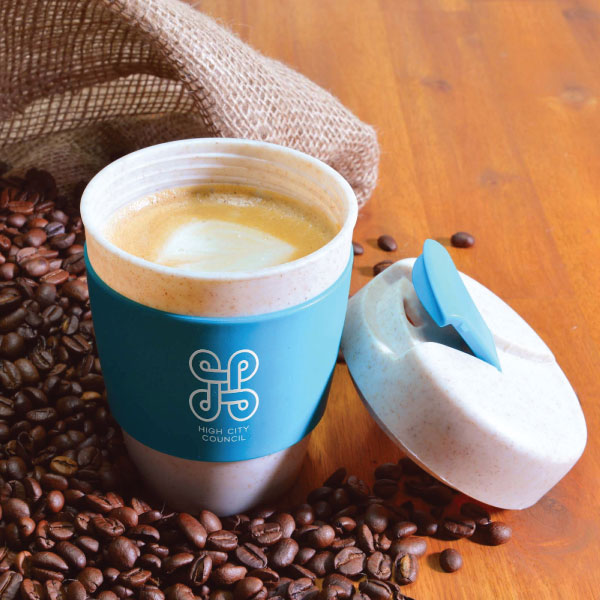 The Bancroft Coffee Cup is a 320ml reusable coffee cup made from a 50/50 blend of wheat fibre and BPA free polypropylene. Includes heat resistant silicone sleeve and screw on lid. Nominate your choice of flip lid and silicone sleeve colours. For logo longevity hand washing is recommended. One Colour Print only.