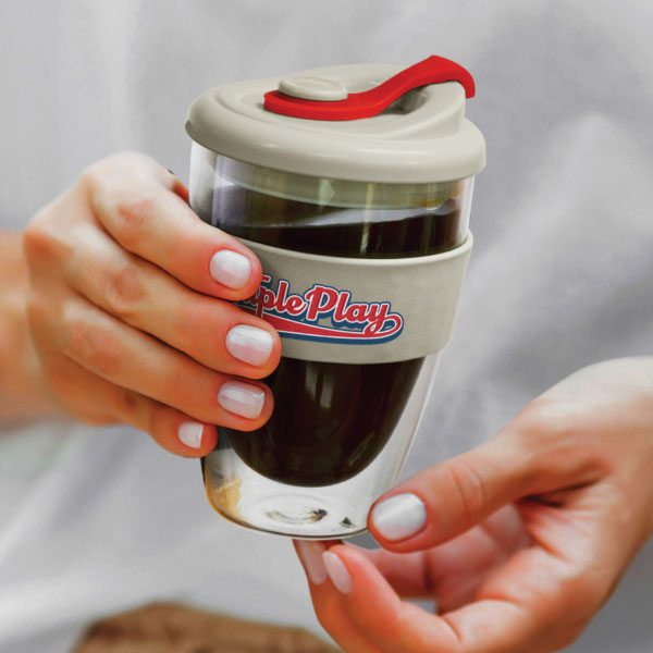 This 350ml double wall borosilicate glass coffee cup is perfect for coffee, tea or any other hot/cold drinks. It has a secure push-on polypropylene lid with silicone swivel closure and a wide heat-resistant silicone band. Borosilicate glass is incredibly light and very strong. The silicone flip closure can come in a host of different colours, to suit all tastes!