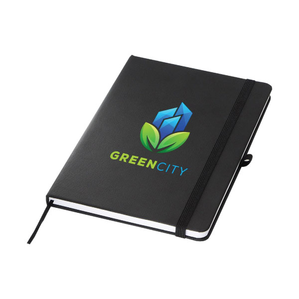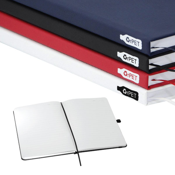 The Beryl rPET A5 Notebook is an eco-friendly notebook that is made of recycled PET and 80gsm recycled paper. It features a hard cover, 9mm elastic closure and a convenient pen loop. The rPET logo is on the spine along with recycle information on the inside front page. Gift box is available on request.