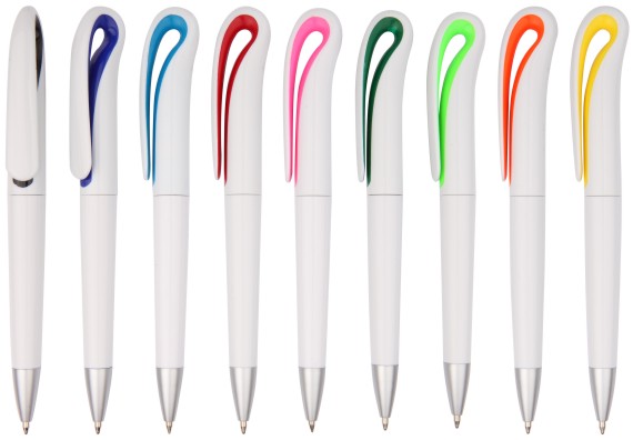 The Blaxland Plastic Pen is a funky and fun style with it's white barrel, twist action and silver tip. The curled clip is totally unique and will be a giveaway gift to remember. It also includes a 1.0mm ballpoint German ink refill with 1,800m capacity.