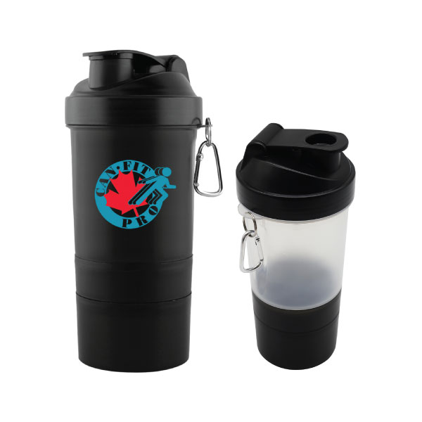 Our Boost 3 in 1 Sports Shaker featuring 3 compartments – the bottom for powder, the middle for supplements and a large upper area for shaking/mixing – this 400ml. The Boost 3-in-1 Sports Shaker includes a carabiner key chain and blender screen to help mix powders faster. Material: PP & PE Plastic.