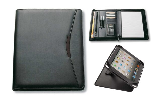 The Bourke A4 Zippered Compendium includes zippered closure, internal gusseted pocket, internal zippered pocket, 2 pen loops, business card holders, solar powered calculator, gun metal badge, zipper closure and A4 size lined pad which inserts from the top. Will accommodate a side entry pad. Pens not included. Engrave silver on metal badge. Talk to us about optional tablet holder. See image for product colour.