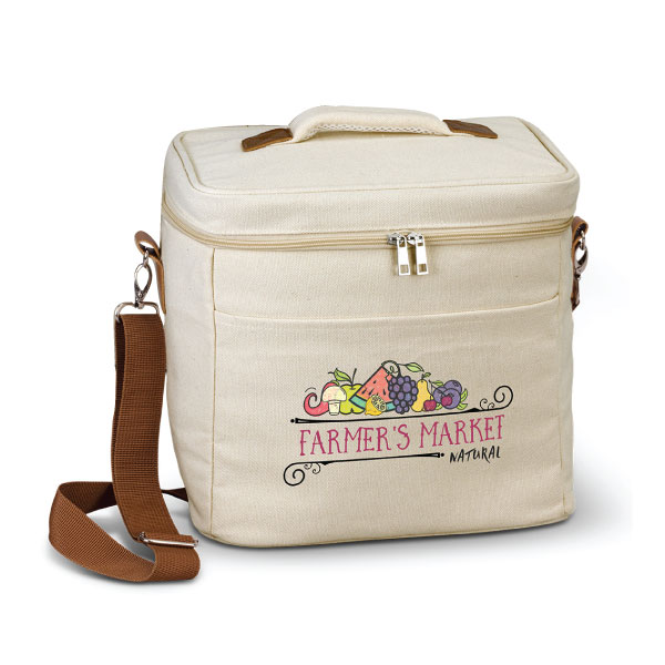 This cooler bag is perfect for days at the beach. It has a large 19L capacity and has PE foam insulation encased in a PEVA lining, so will keep your food & drink nice and cool. The outer construction is natural 450gsm cotton canvas, so hard wearing. The bag has stunning leather-look PU accents, a woven carry handle and also an adjustable and removable shoulder strap. It has a zippered top closure, piping details and a large front slip pocket. It is priced here for a full colour print, so your branding will really stand out on this gorgeous cooler bag.