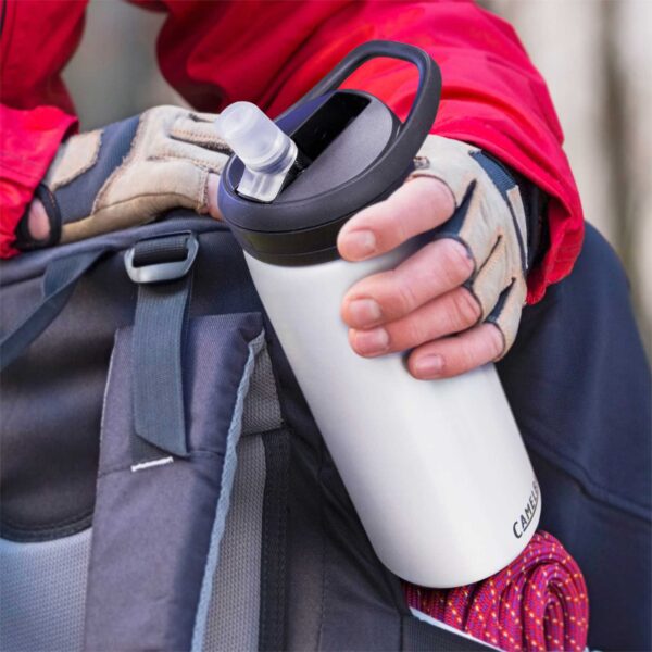 The CamelBak® Eddy+ Vacuum Bottle - 600ml is a robust double wall, vacuum insulated stainless steel bottle that keeps drinks cold for six hours or hot for up to four hours. The bottle has a tough powder coated finish and a flip valve which is spillproof when open, leak-proof when closed and is easily removed for cleaning. It features a unique medical-grade silicone bite valve for easy, drip free sipping. Handwashing is recommended.