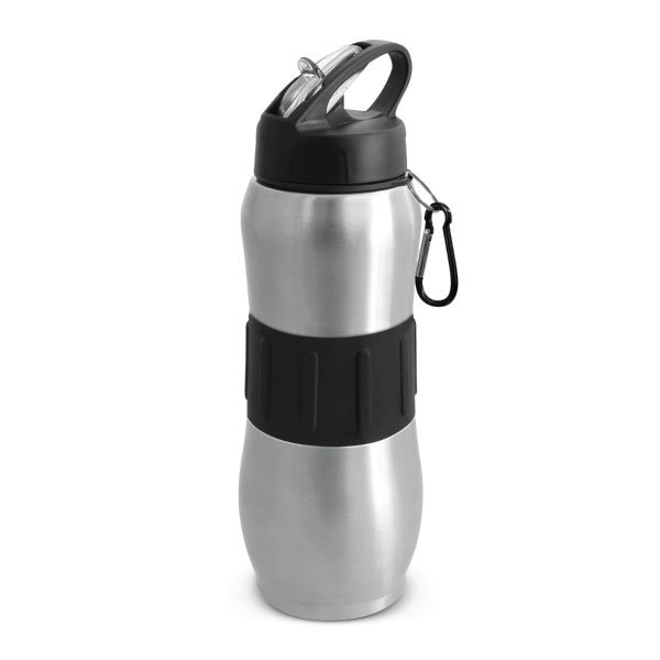 Our Charlton Metal Water Bottle is an ergonomic 830ml stainless steel drink bottle. It has a secure screw on lid with a flip out drinking valve and a stylish carry handle. The Charlton has a smart soft touch silicone band, a handy carabiner and is BPA-free. The silver bottle laser engraves to a natural etch and gunmetal engraves to a shiny steel finish. It is supplied in a black gift box. Handwashing is recommended.