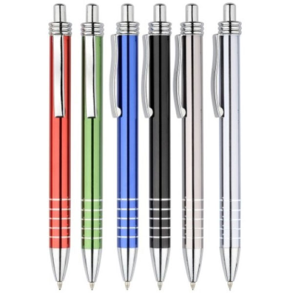 The Chelsea Metal Pen is available in 7 vibrant colours in your choice of either blue, red, green, black, silver, gunmetal or orange. These competitively priced promotional metal pens are designed with shiny chrome plated trims and an anodised aluminium barrel with metal clip. They feature push action, retractable nib with black ink inside to 1,200m capacity.
