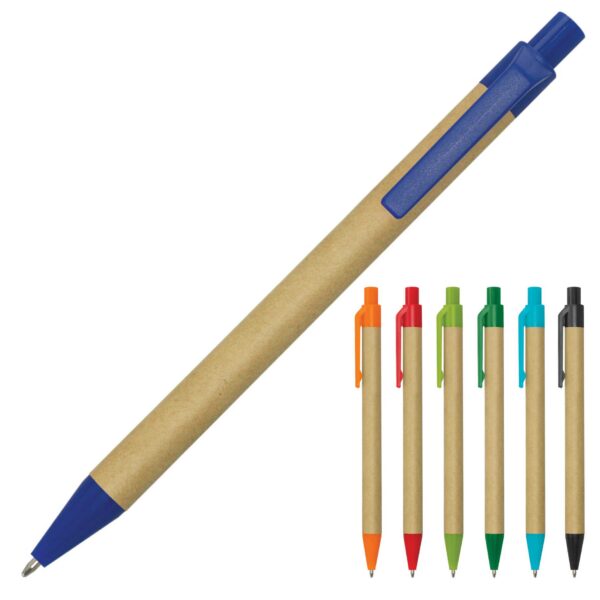 The Childers Eco Pen is an environmentally friendly retractable ball pen with a recycled cardboard barrel. It has a blue refill with 1000 metres of German manufactured DOKUMENTAL ink and a tungsten carbide ball for improved writing quality.
