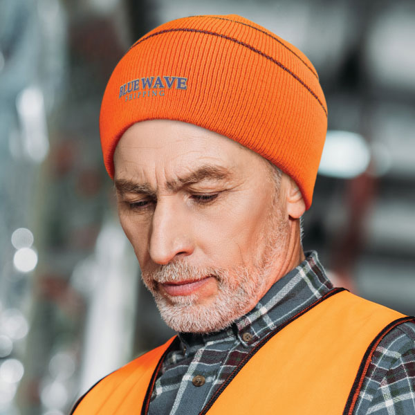 The Chippy Hi-Vis Beanie is a high visibility close-fitting beanie knitted from acrylic yarn. It is available in one size which will fit most people. This product aids with visibility in the workplace.