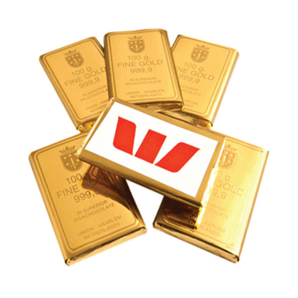 Delicious paper-wrapped chocolate gold bullion, with your brand printed onto a high quality rear adhesive!