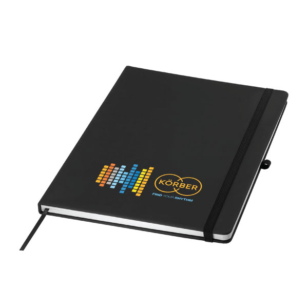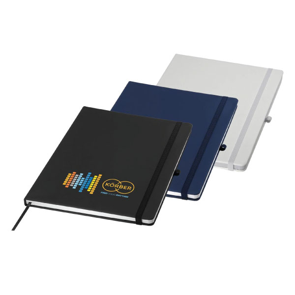 The Clayton A4 Notebook is the ideal size for conferences and educational events and has 160 pages. Made from 80gsm recycled paper with soft-touch cover, these notebooks feature an elastic closure, pen loop and ribbon marker and are perfectly suited to feature your logo.