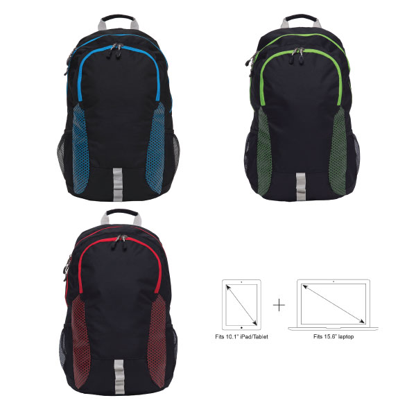 This backpack is both stylish and functional. It comes in black with 3 contrasting colours of lime, red & cyber blue, so there is a colour for everyone's tastes! There is a foam padded laptop compartment and also a compartment that will fit an 11" iPad/tablet so all your devices are catered for! There are also 2 mesh drink bottle pockets to keep hydrated on the move. The shoulder straps are padded for comfort and there also has adjustable sternum straps to keep the bag comfortable even when fully laden.