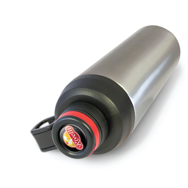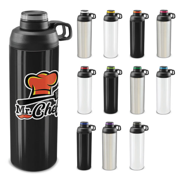 Our Coolah Metal Water Bottle is a large 900ml stainless steel drink bottle which has a secure screw on lid with a flip cap that has the option of adding a smart resin coated logo on the top. The black and white bottles laser engrave to a shiny steel finish and the silver bottle engraves to a natural etch. Handwashing is recommended. See image for silicone band colours.