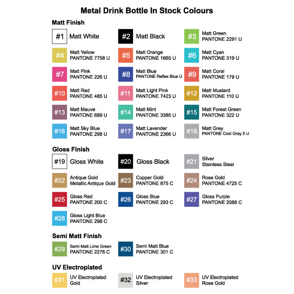 - Choose from 33 colours or get PMS matched bottles