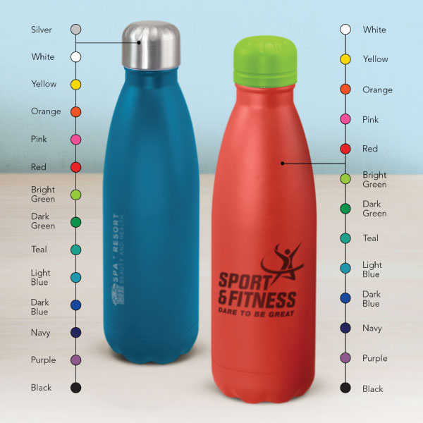 Our Dallas Premium Vacuum Bottle is a trendy 500ml double wall, vacuum insulated stainless steel drink bottle with a stunning powder coated finish. It has a powder coated screw on lid as well as a classic stainless steel option. The bottle and lid can be mixed and matched in any colour combination from the standard colours. Up to five different colour combinations are included in the price and more are available for an additional charge. It is presented in a black gift box and an optional gift tube is available on request. Handwashing is recommended.