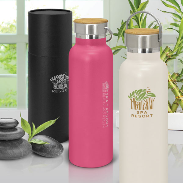 Our Deakin Premium Vacuum Bottle is an impressive 650ml BPA-free, double wall, vacuum insulated stainless steel drink bottle which has an extremely durable powder coated matt finish. Stainless steel or bamboo veneer lid offers prominent branding opportunity. The lid laser engraves to a natural etch and the bottle laser engraves to a shiny steel finish. It is nicely presented in a black gift box or an optional gift tube. This product is not dishwasher safe and handwashing is recommended.