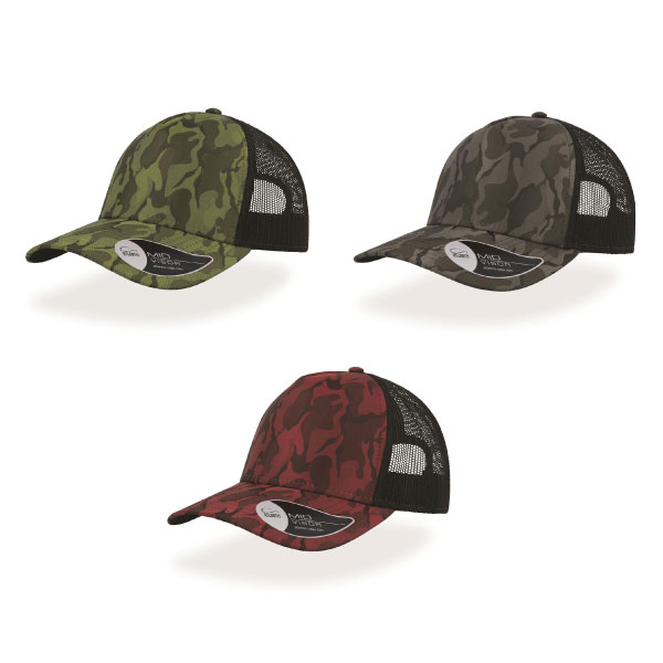 The Delta Camo Trucker Cap made from satin polyester combined with the camouflage fabric makes is trucker cap perfect for the music world and fashion. Fabric: front/bill/underbill/button: 92% polyester 8% viscose. Side and back: 100%polyester - underbill: 100% cotton.