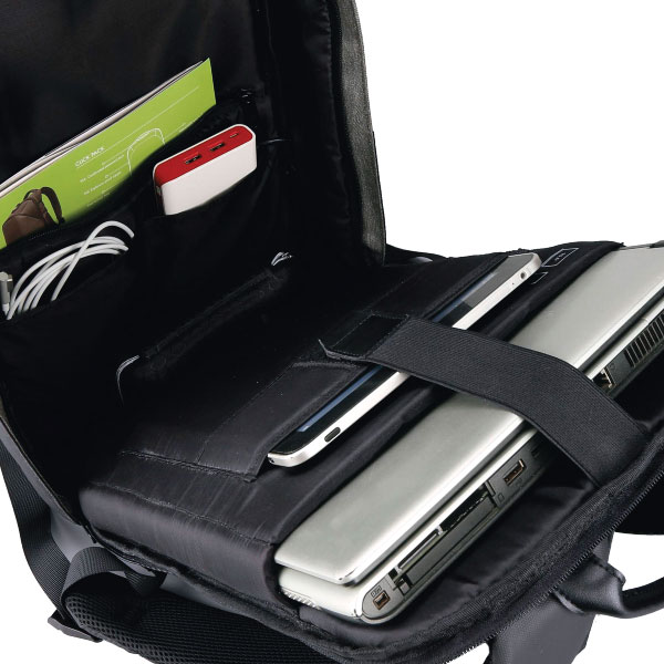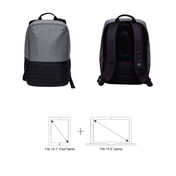 - Main zippered fully cell foam padded universal storage compartment including dual 15.6” laptop and 10.1” tablet compartments with Velcro closure