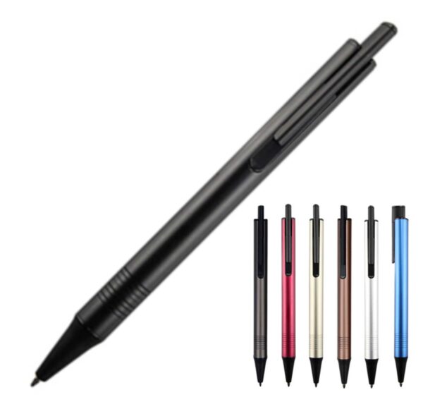 The Duchess Metal Pen is made from aluminum and is a stylish design pen with black plastic click and tip and wide printing area. Click action with plastic Parker type German black ink refill Supplied, 1200m, tungsten Carbide Ball.