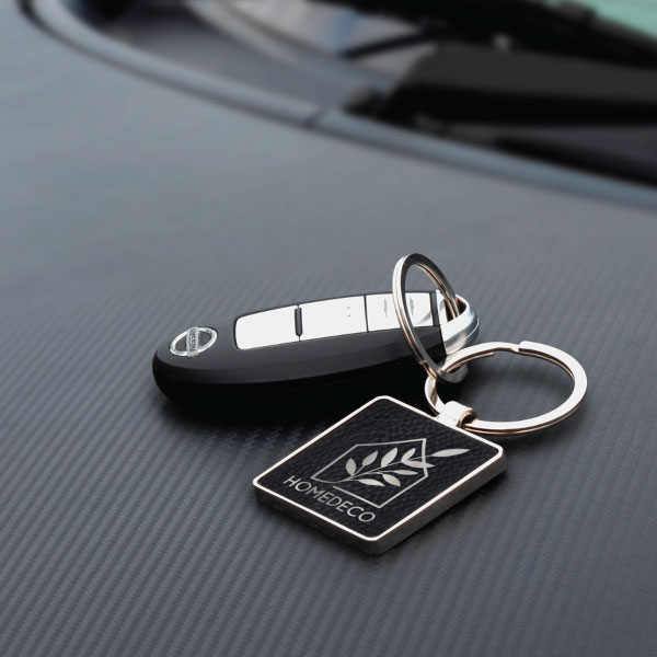 Make this stylish key ring your next giveaway and showcase your branding! The Eden Square Keyring is made from a shiny nickel with a black textured PU that engraves to a silver finish. It comes in a black individual gift box.