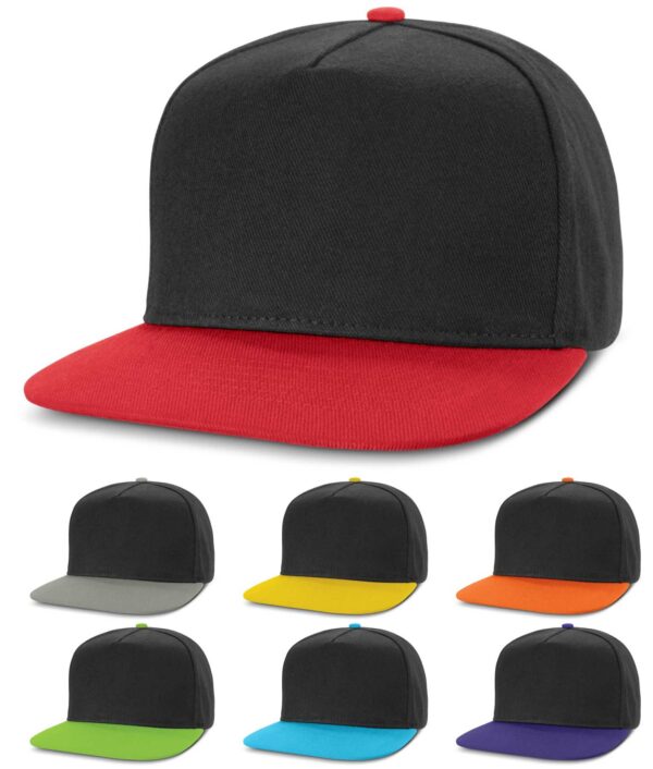 The Edge Flat Peak Cap is a premium structured five panel cap which is manufactured from heavy brushed cotton. It has a trendy flat peak with a matching button. Other features include embroidered eyelets, a sweat band and an adjustable snap back closure that allows one size to fit most people.