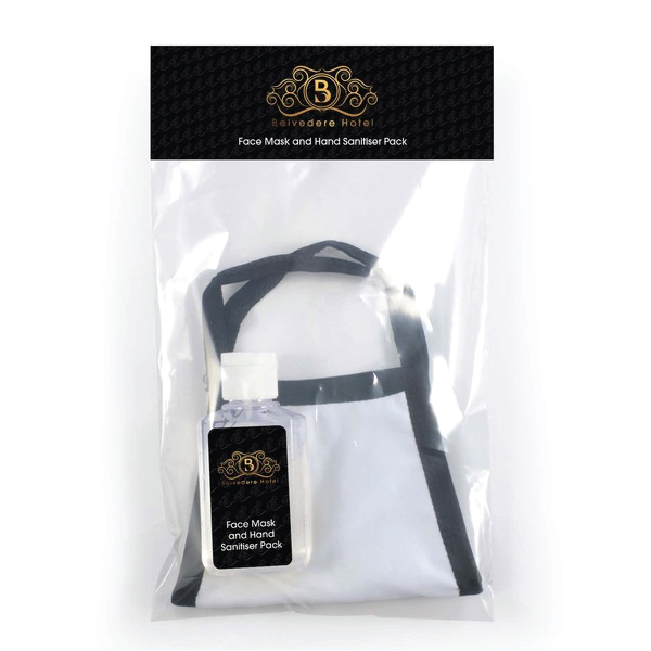 Pack containing hand sanitiser and shield cotton face mask in individual poly bag.