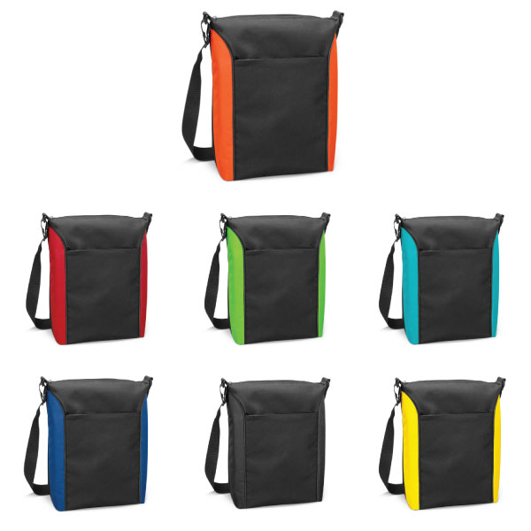 Our Eureka Conference Cooler Bag is a unique satchel style conference or event bag that is also a 10L cooler bag. This radical multi-purpose bag has increased sustainability as it can be used for many years after the event. It has PE foam insulation encased in a waterproof liner and the outer construction is rugged 600D polyester with a large zippered pocket on the front. Other features include a zippered top closure, an adjustable woven shoulder strap, trendy patterned piping on the front and a business card holder on the reverse.