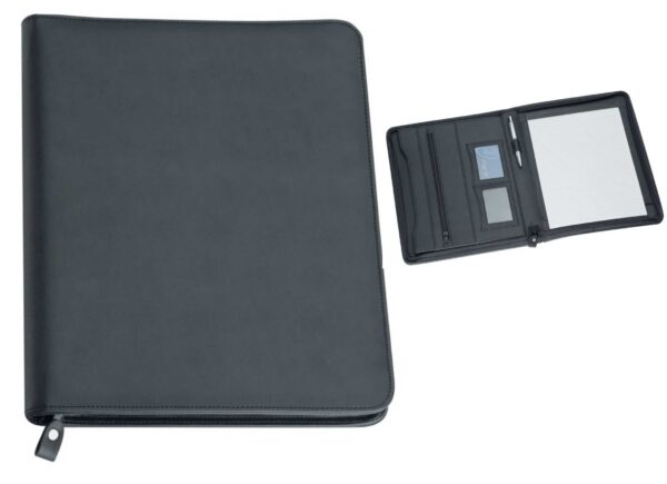 The Fingal A4 Zippered Compendium features a zippered closure, internal gusseted pocket, internal zippered pocket, business card holders, pen loop and lined pad which inserts from the top. Pen not included. See image for product colour.
