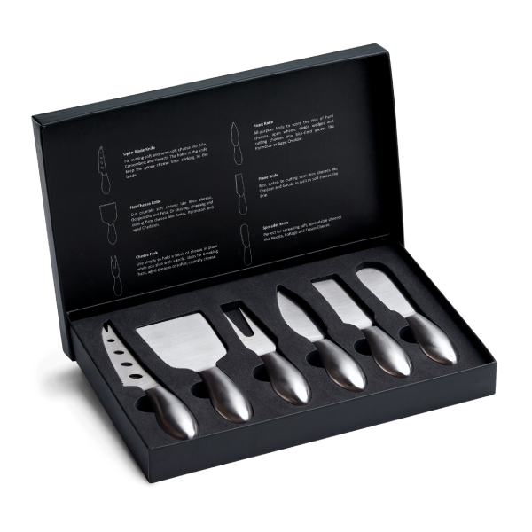 This cheese knife set is perfect for all types of cheese. The set comprises of a 15cm open blade knife, 13cm flat cheese knife, cheese fork, plane knife, 13.5cm heart knife and spreader knife. There is also a handy guide for all 6 pieces to know which knife is used with which types of cheese. The knives are presented beautifully in a 2 part presentation box, so makes a perfect gift for clients of family. Priced here for a 1 colour print on the box. We can also engrave each utensil if you want to personalise them, just ask our friendly staff for pricing.