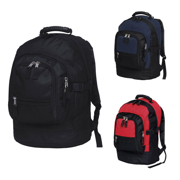This backpack is a perfect school or sports team bag. Made from durable 600D polyester with a latex rubber backing, it also features 3 zippered front compartments for easy access. It has heavy duty zippers and accessories & rubber feet for added protection and a heavy duty moulded rubber handle.