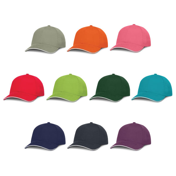 The Fusion Sandwich Peak Cap - White Trim is a premium quality, structured six panel cap which is manufactured from heavy brushed cotton. It features embroidered eyelets, a pre-curved peak with white sandwich trim, a sweat band and an adjustable closure with a matt chrome buckle which allows one size to fit most people.