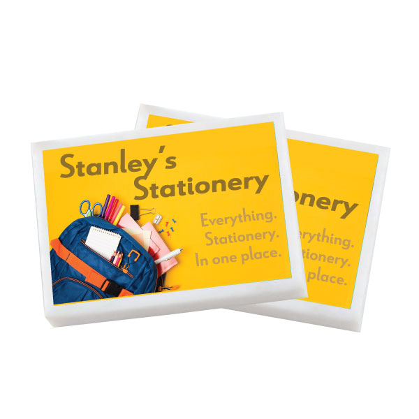 The Glitz Fluro Eraser is a rectangular eraser with a large print area for your branding or messaging. Very popular as a low cost giveaway for schools, professionals and educational events.