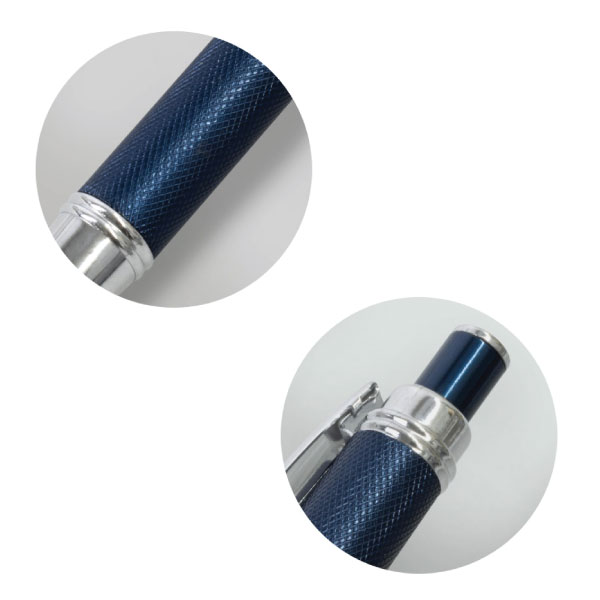Our Grant Metal Pen is a aluminium ball pen with a gloss anodised barrel with a unique guilloche textured finish. It has a black refill with 800m of writing ink and the barrel laser engraves to an oxidised white colour. It can be presented in an optional pen sleeve or a gift box.