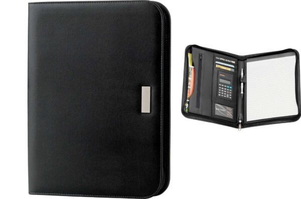 The Gunnedah A4 Portfolio is a stylish A4 compendium with solar calculator and zippered closure. It includes refillable 30 page writing notepad, front open document pocket, internal expanding pocket, zippered pocket and pen loop (pen not included). See image for product colour.