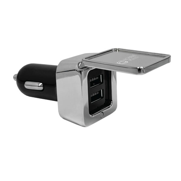 Always be charged with this quality dual USB metal car charger made of ABS plastic and metal square. It has a flip lid with a maximum output of 2.1A CE, and is RoHS complied.