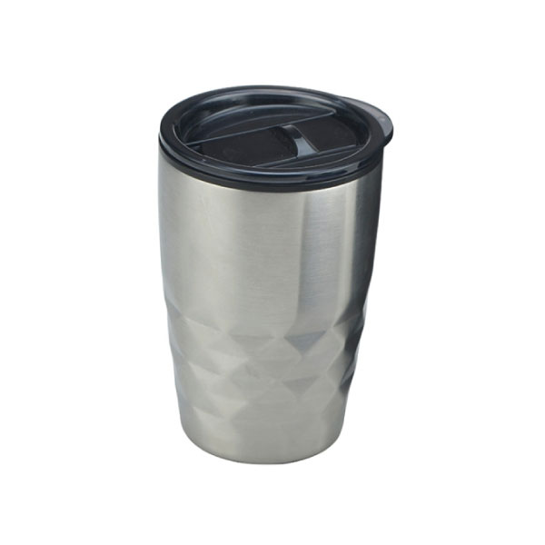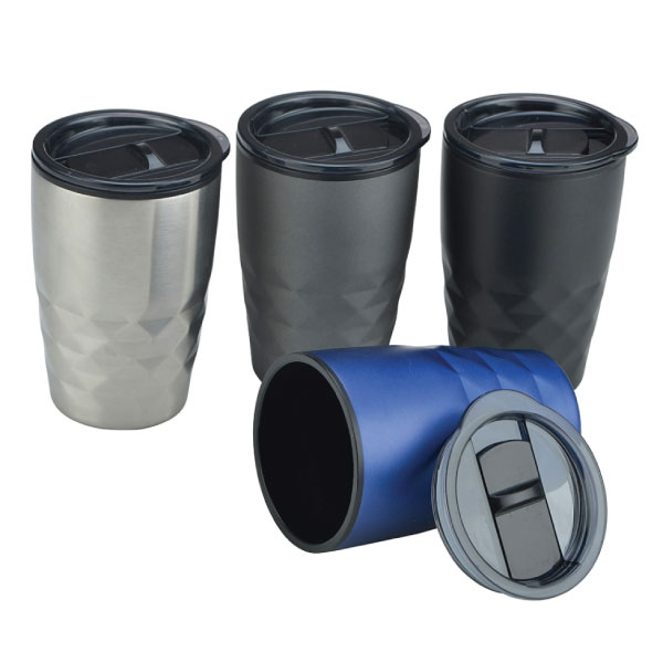 The Ikana Coffee Mug is a trendy 350ml double wall coffee cup which will keep drinks hot for longer. It has a smart diamond patterned stainless steel outer wall and a polypropylene inner wall. They feature a secure plastic push on lid with a splash proof sliding closure and a soft non-marking base. It laser engraves to a stainless steel finish and is BPA free. Handwashing is recommended.
