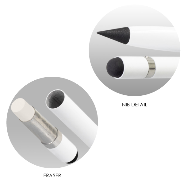 This incredible stylus pen features a special metal alloy tip which you can write with. As you write tiny deposits of the metal will be transferred onto the page. This pen doesn't need sharpening and uses no refills so it is a great way to be environmentally conscious. Perfect for use on touchscreens! Check out our other wooden barrel & kraft Infinity Inkless Pen!
