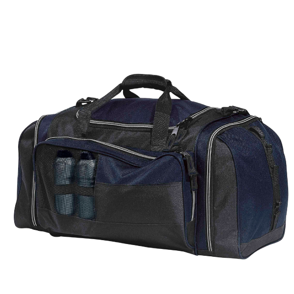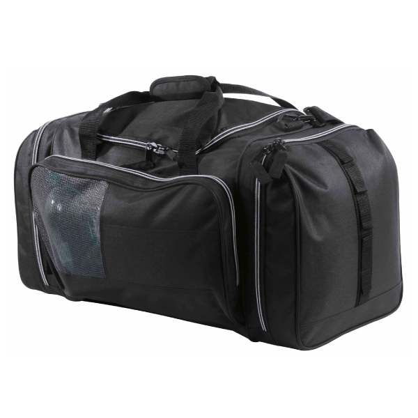 The Kamakazzi Sports Bag has a huge main compartment in a U shape, so it makes it easier to get your bulky items in. There are 2 daisy chain gear loops on each end and also 2 zippered end compartments and a handy drink bottle storarage unit inside the mesh compartment on the front of the bag. The shoulder strap is detachable/adjustable and padded for comfort. All finished off with heavy duty zippers and accessories