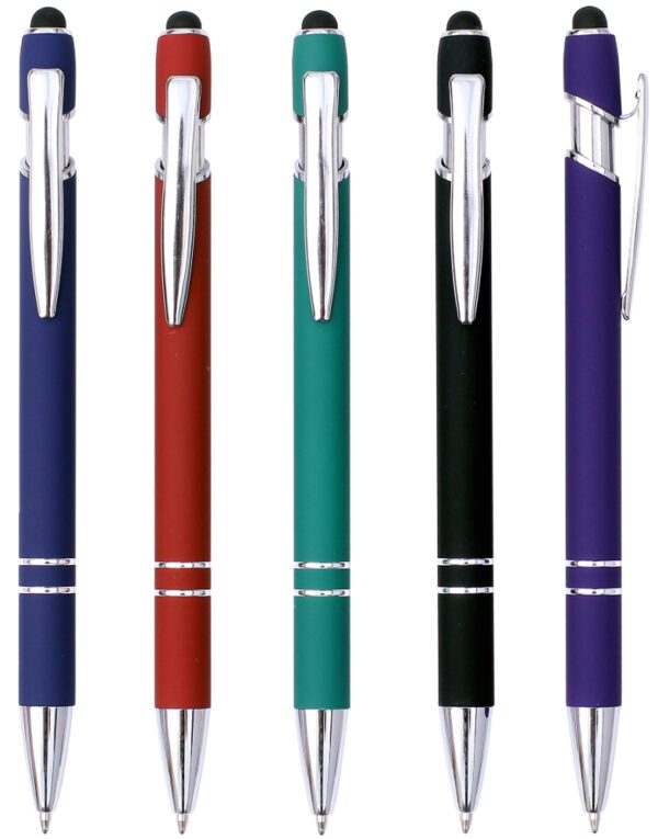 TheKennedy Metal Stylus Pen is a new style with rubber coated finish give it a touch of class and very comfortable to write with, making it perfect for any office or school situation. Available in 5 modern colours, metal clip, polished chrome trim and push action. German black ink.