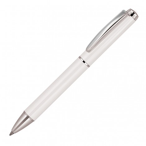 Elegantly presented in white with chrome trim, the Magellan Metal Ballpoint Pen has plenty of room on the cap for your logo to be printed or laser engraved (chrome finish). A twist action, retractable black ballpoint pen with soft black ink, flows smoothly from the Swiss refill made in Switzerland – 5,900m.